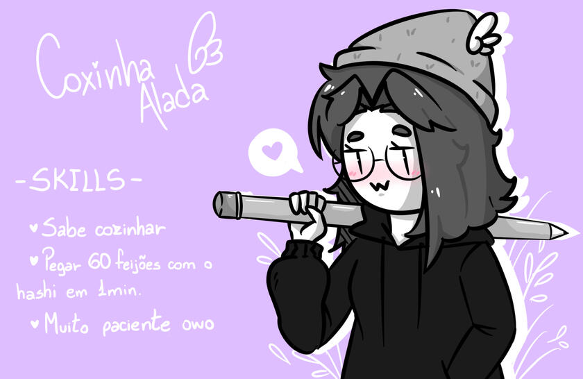 Estou ativa nas redes sociais com minha arte desde 2013, mas sem muitas expectativas. Em 2019, quando iniciei a faculdade, comecei a desenhar nos quadros que haviam nos corredores de lá, então começaram a me procurar para elogiar as artes e isso me incentivou a melhorar o que eu gostava de fazer. Prefiro desenhar no papel, de vez em quando faço arte digital. As vezes aceito alguns pedidos de Commissions também!Minha maior inspiração é meu pai, que sempre desenhava pra mim quando eu era pequena. Até então eu desenho por hobby.